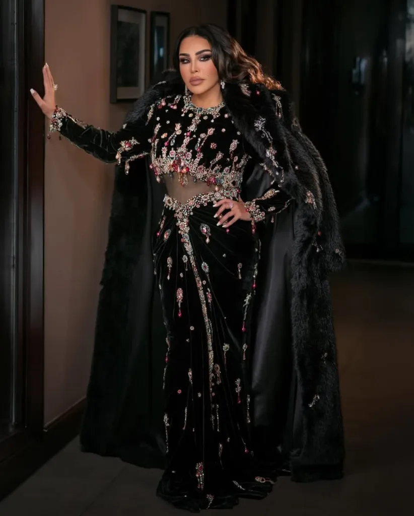 اختارت أحلام زيًا من مجموعة الأزياء الراقية “هوت كوتور” لخريف وشتاء 2025-2026. تميز التصميم بقماش المخمل الأسود الفاخر الذي يعكس رقيًا كلاسيكيًا. زين الزي بأحجار كريمة وكريستالات متعددة الألوان أضفت بريقًا خاصًا.