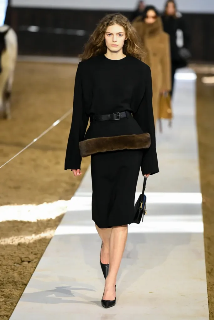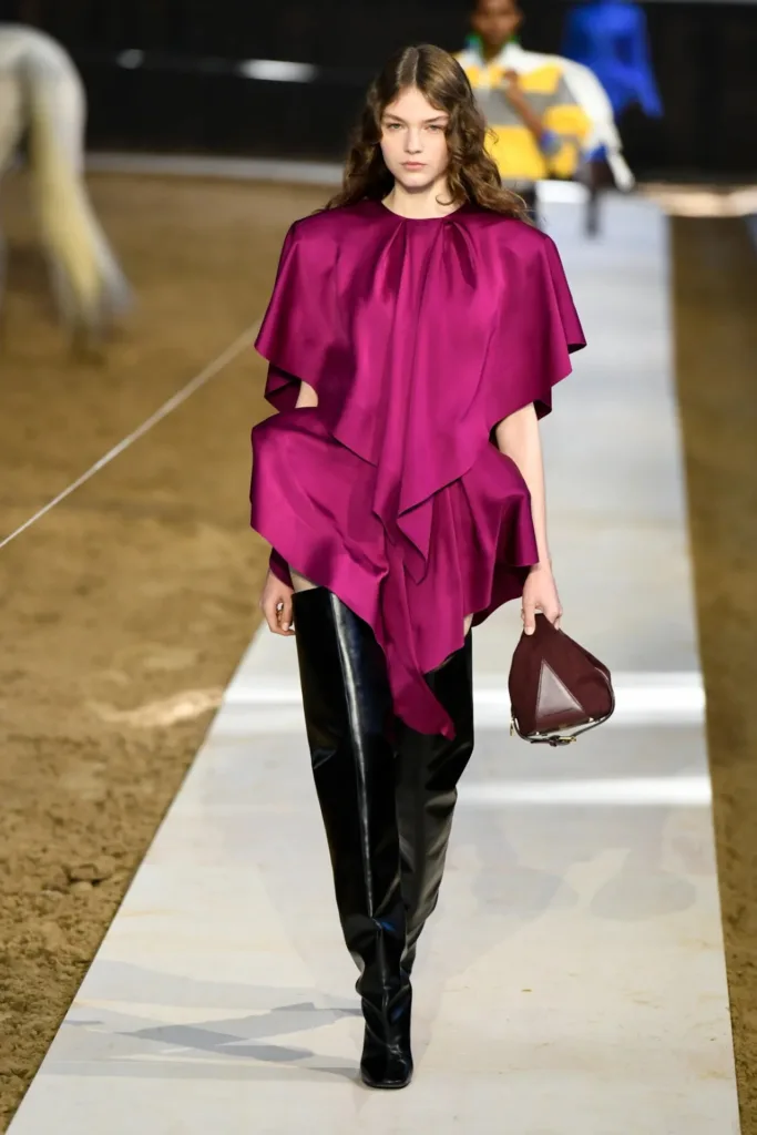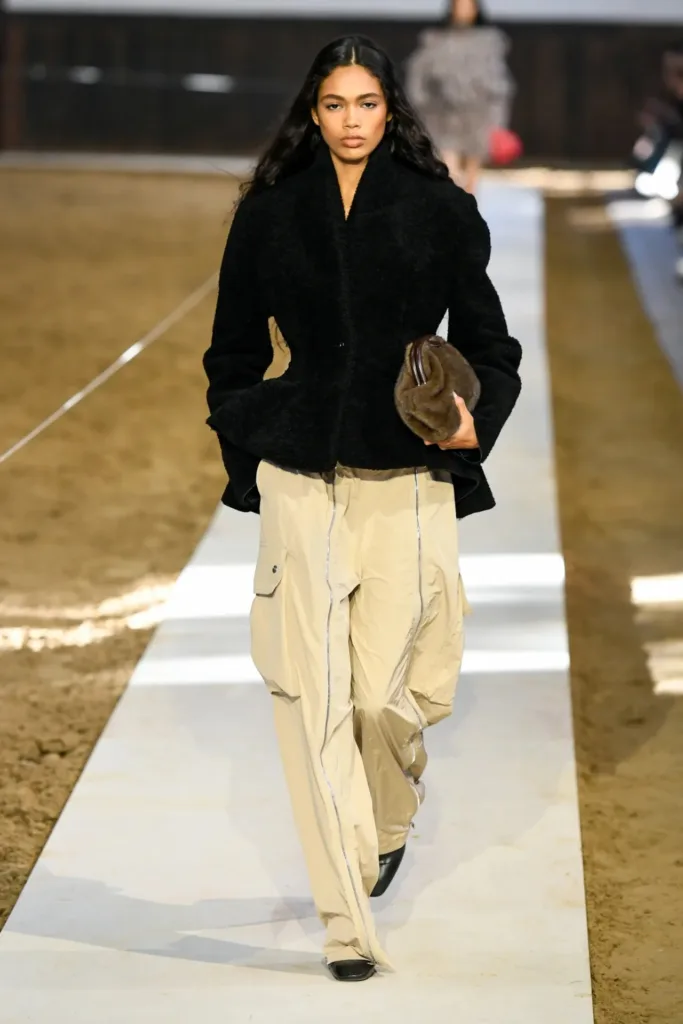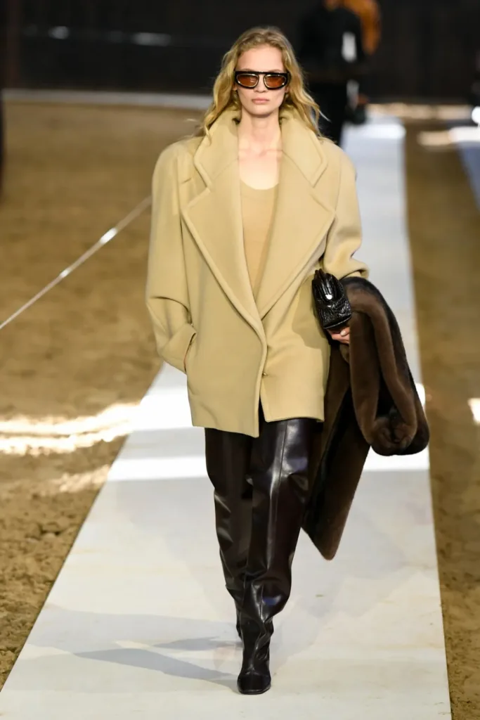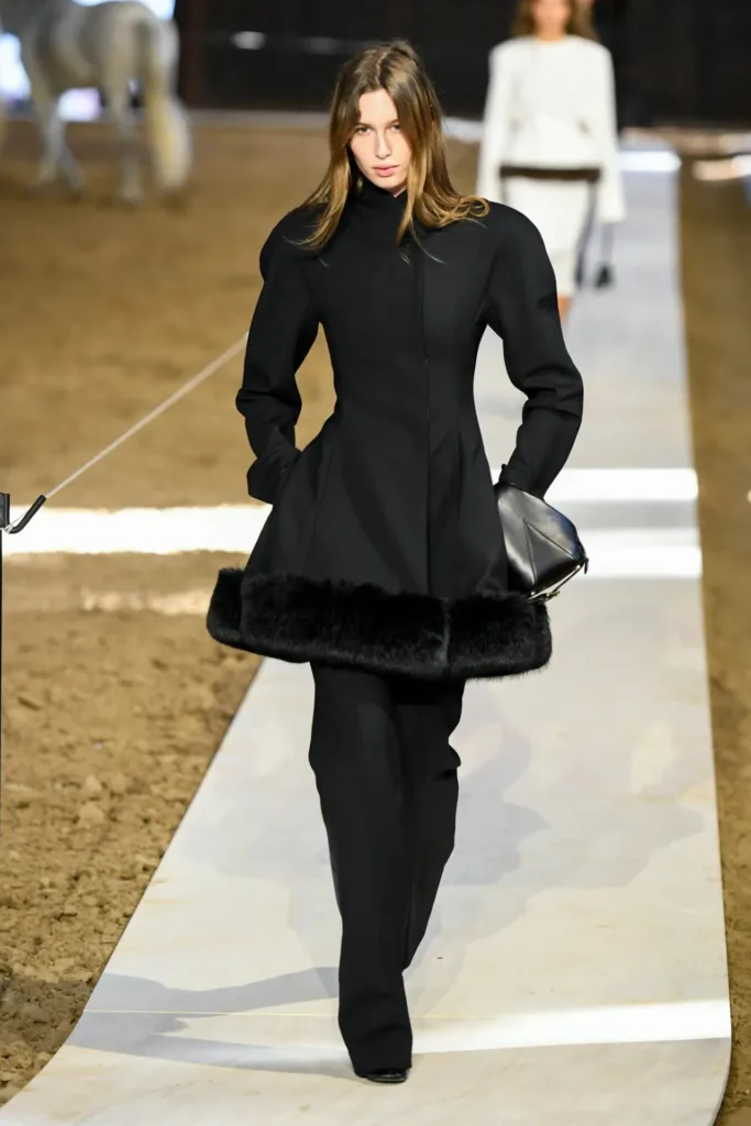 البدلات شكّلت عصب المجموعة: سترات مهيكلة بأكتاف واضحة لكن بمرونة في القصّة، مع بناطيل ضيقة تتحول في بعض الإطلالات إلى “stirrup pants” (بنطال مع شريط يمر أسفل القدم) يستحضر عالم السرج والفروسية. هذا المزج بين التايلاورينغ الكلاسيكي والعنصر الرياضي منح الإطلالات طابعاً عملياً، يصلح للمكتب كما يصلح للخروج مساءً مع إضافة إكسسوارات بسيطة.