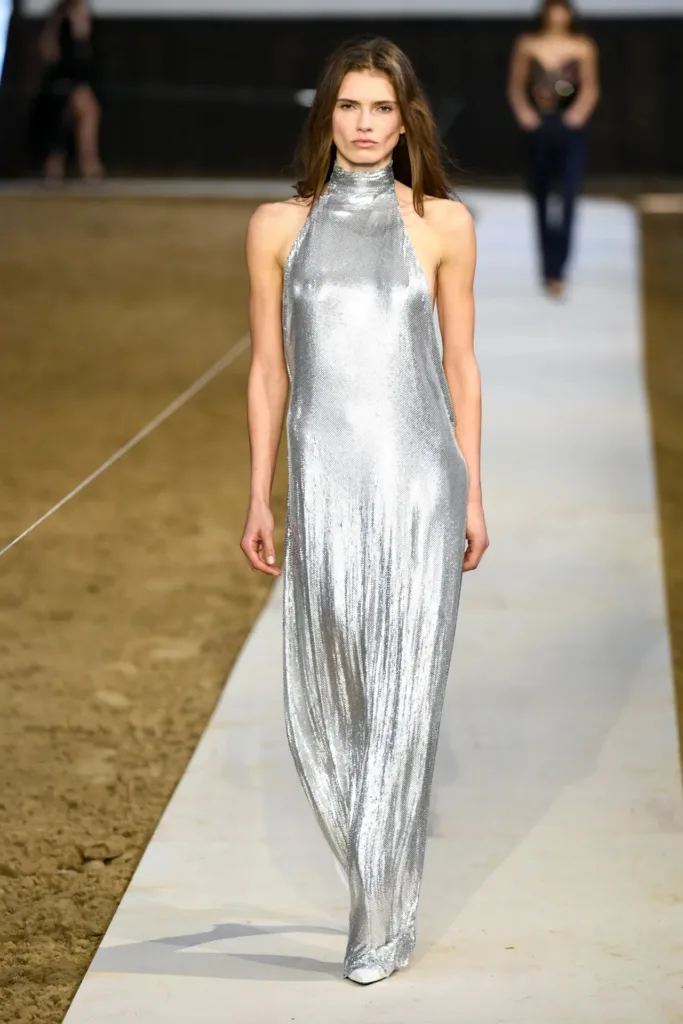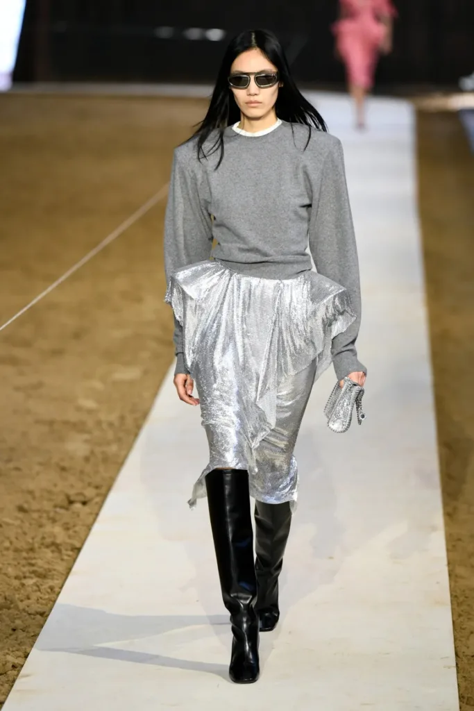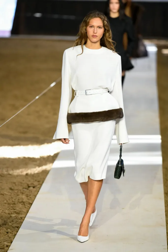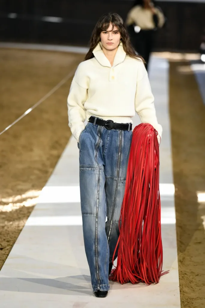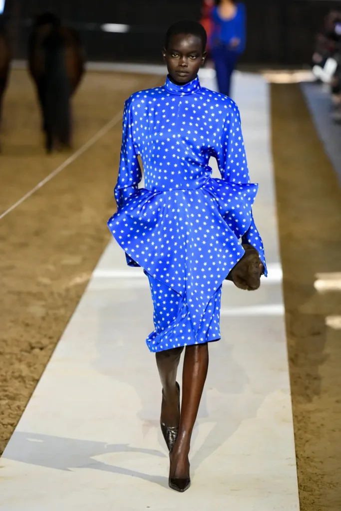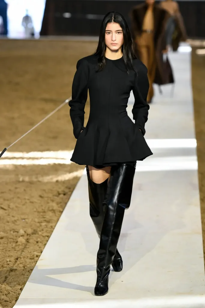 البدلات شكّلت عصب المجموعة: سترات مهيكلة بأكتاف واضحة لكن بمرونة في القصّة، مع بناطيل ضيقة تتحول في بعض الإطلالات إلى “stirrup pants” (بنطال مع شريط يمر أسفل القدم) يستحضر عالم السرج والفروسية. هذا المزج بين التايلاورينغ الكلاسيكي والعنصر الرياضي منح الإطلالات طابعاً عملياً، يصلح للمكتب كما يصلح للخروج مساءً مع إضافة إكسسوارات بسيطة.