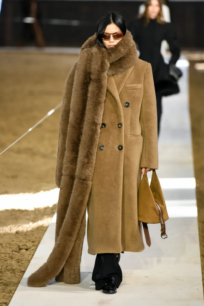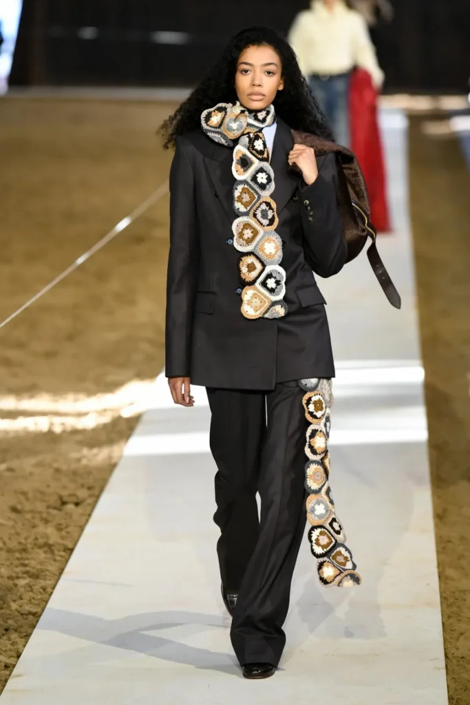 لم تغب فكرة “التدفئة الذكية” عن المجموعة: أوشحة كروشيه متعددة الألوان وقطع محبوكة بأحجام مريحة أضافت طبقة إنسانية ومرحة إلى الإطلالات الأكثر صرامة. هذا الاستخدام للكروشيه الملوّن عمل كعنصر تليين بصري لبدلات رسمية ومعاطف بنبرة داكنة، فحوّل بعض اللوكّات إلى إطلالات شارع قابلة للتبنّي بسهولة من قبل جمهور شاب.