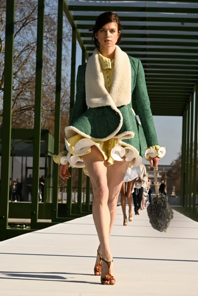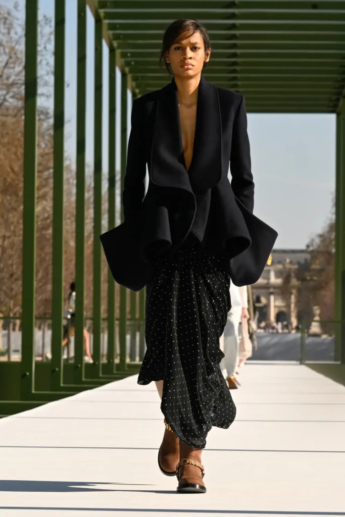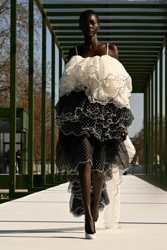 - الافتتاح بثلاث تنانير ميني تنفجر منها طبقات مجمّعة تمتد إلى ذيول تلامس الأرض، منسّقة مع جاكيتات مخصّرة وأحذية منقّطة بالبولكا دوت، قدّم فورًا فكرة اللعب على الحجم: الجزء العلوي منضبط، والسفلي شاعر ومتلألئ.