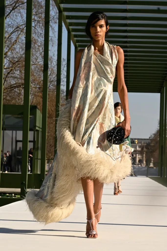 - الأقمشة تنوعت بين التول المتعدد الطبقات، الساتان، الدانتيل، والتوييد الناعم، إلى جانب الدنيم الذي لعب دورًا مفاجئًا: جينز مستقيم الساق مُطرّز أو مطبوع بزخارف تشبه ضربات فرشاة مونيه.