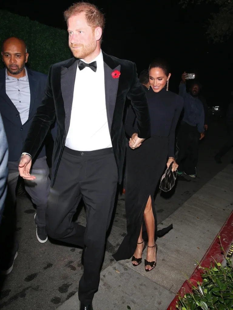 أما الأمير هاري فارتدى بدلة سهرة كلاسيكية سوداء مع قميص أبيض وربطة عنق، مع دبوس الخشخاش على صدره احتفالاً بيوم الذكرى. ارتدت ميغان ماركل بلوزة باللون الأسود بأكمام طويلة مع تنورة طويلة سوداء بفتحة جانبية، وأكملت إطلالتها بكعب عالٍ وحقيبة مخملية سوداء وأقراط لامعة.