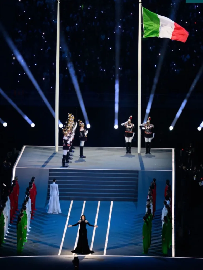 وفق ما نشره موقع Olympics.com، أدّت لورا باوزيني النشيد الوطني الإيطالي «Il Canto degli Italiani» خلال الافتتاح، في فقرة تحمل ثقلاً رمزياً لأنها تربط بين الطقس الرسمي ودفء الصوت الشعبي الذي يعرفه الجمهور داخل إيطاليا وخارجها.