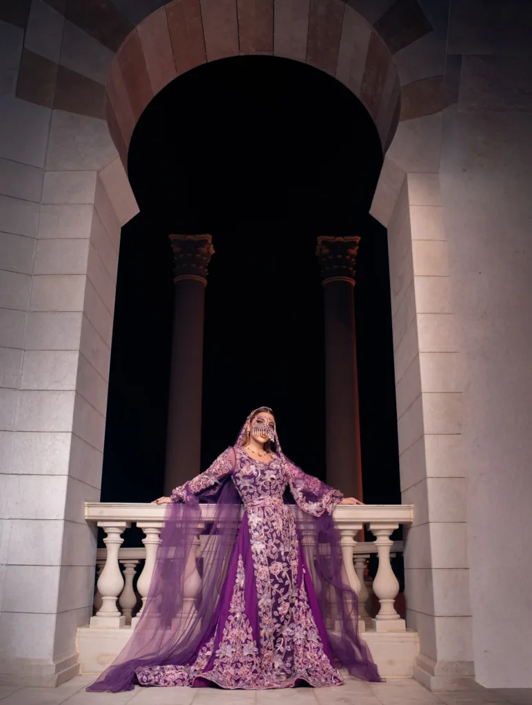 منذ اللحظة الأولى، بدا واضحاً أن أصالة قرّرت أن تتماهى مع المكان لا أن تكتفي بالمرور على خشبته؛ البرقع الإماراتي هنا ليس مجرد أكسسوار فولكلوري، بل عنصر موضة محمّل بدلالات ثقافية: احترام للتراث المحلي، واحتفاء بجمهور اعتادت أن تخاطبه باللهجة قبل الأغنية. اعتماد البرقع مع لوك مسرحي معاصر يمنح الإطلالة بعداً جمالياً مضاعفاً؛ إذ يحوّل ملامح الوجه إلى لوحة تترك للعينين دور البطولة، وهو ما يلتقي تماماً مع شخصية أصالة على المسرح: صوت قوي، وحضور يفيض بالعاطفة، وعينان تحملان القصة قبل الكلمات.