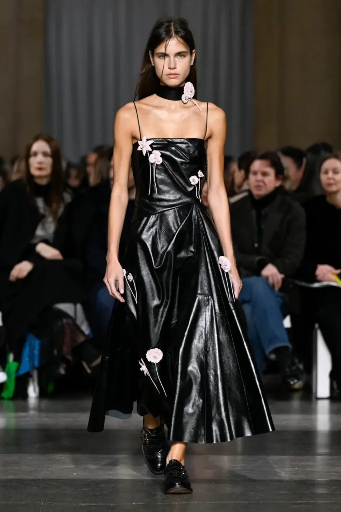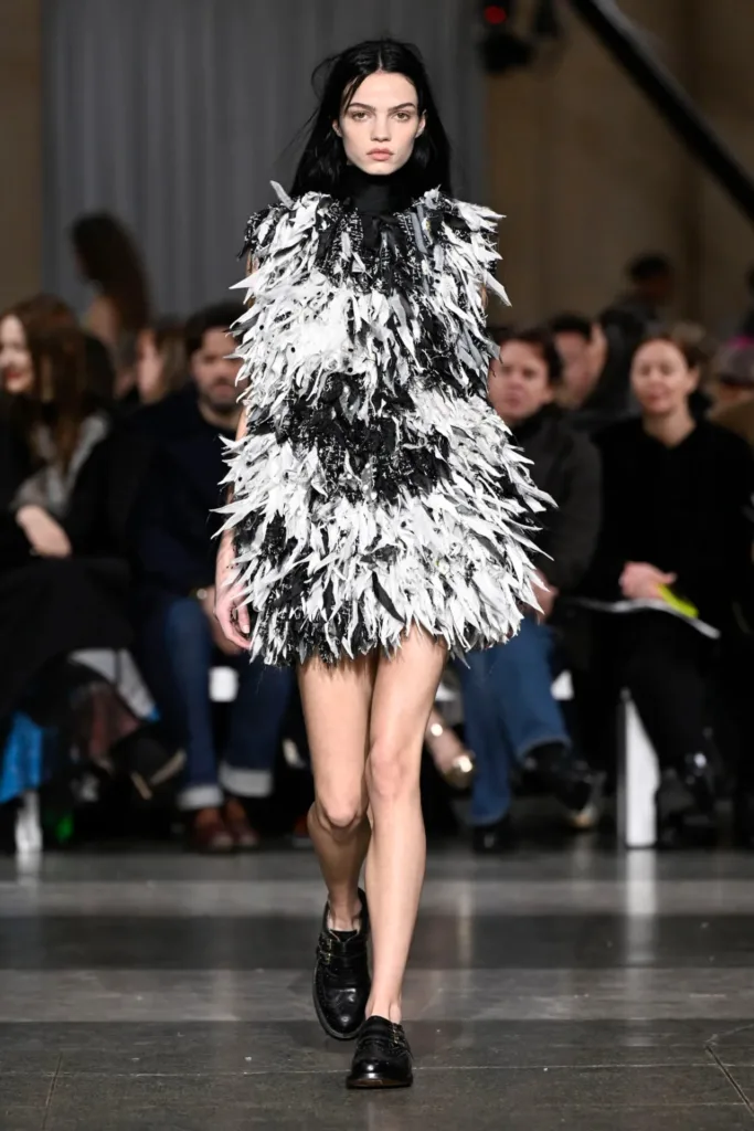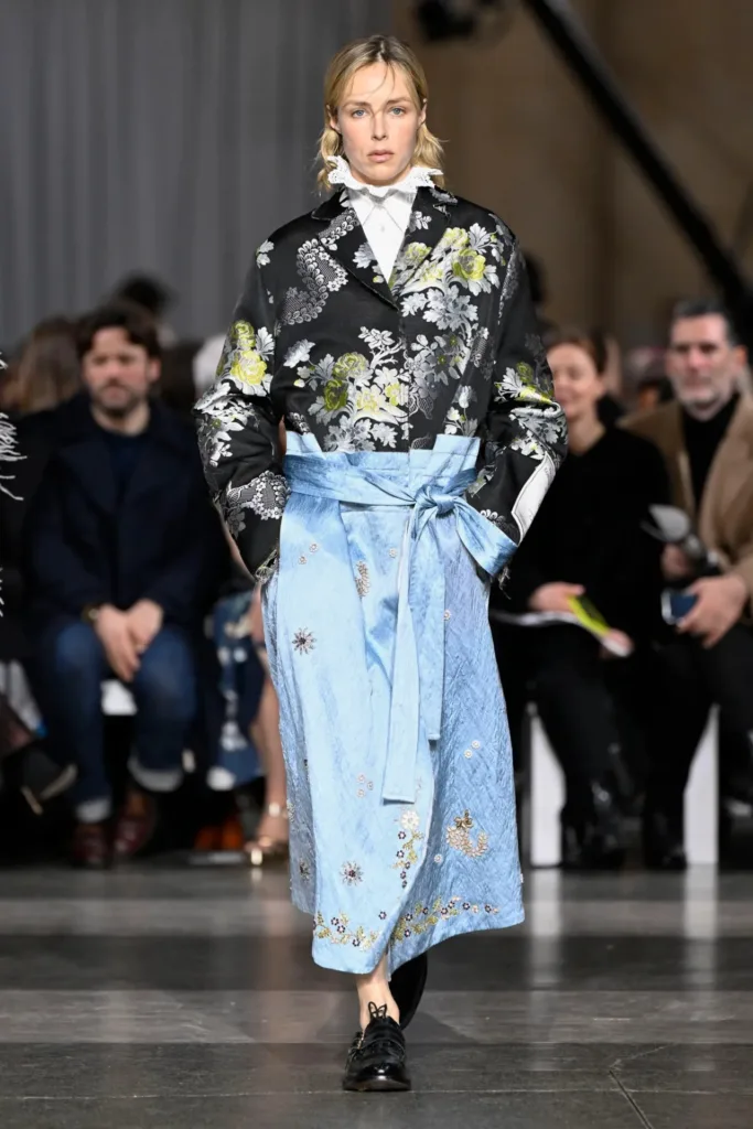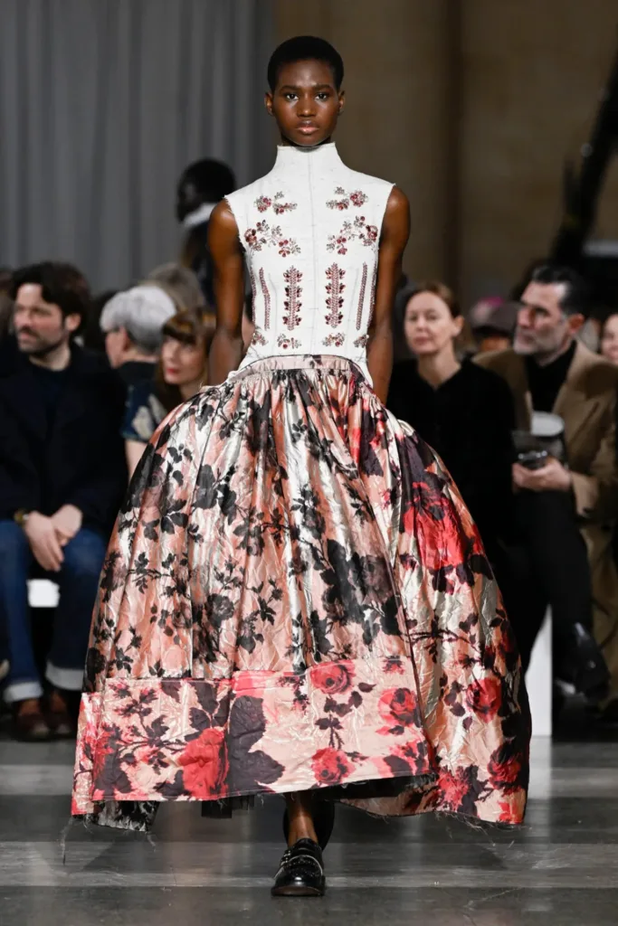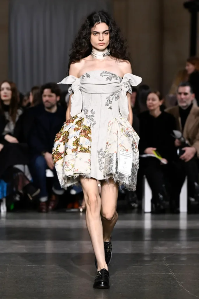 اتسمت الأزياء بطابع التفكيك وإعادة التجميع، وكأنها لعبة “جثة رائعة” (Exquisite Corpse) على نطاق واسع. قطع عديدة بدت “مرقّعة ومُرمَّمة ومُجمَّعة من شظايا قائمة”. فستانان بلونَي زهرة الربيع الباهت والأزرق البنفسجي المائي صُنعا بالكامل من عيّنات تطريز محفوظة من عروض سابقة، أُعيد دمجها وتطريزها من جديد.