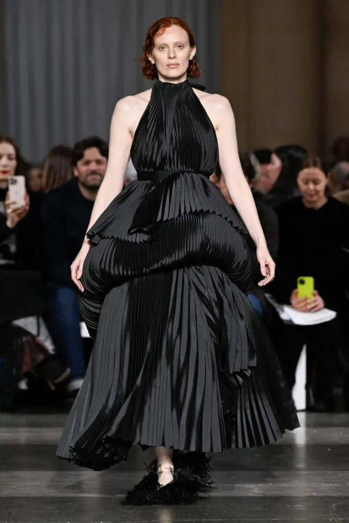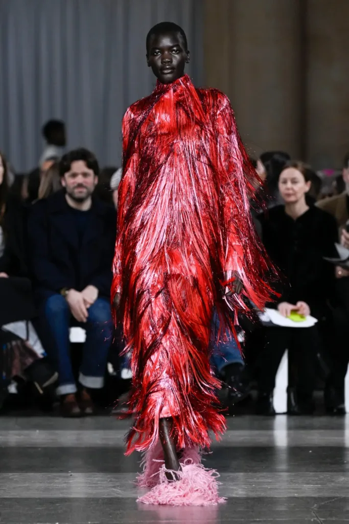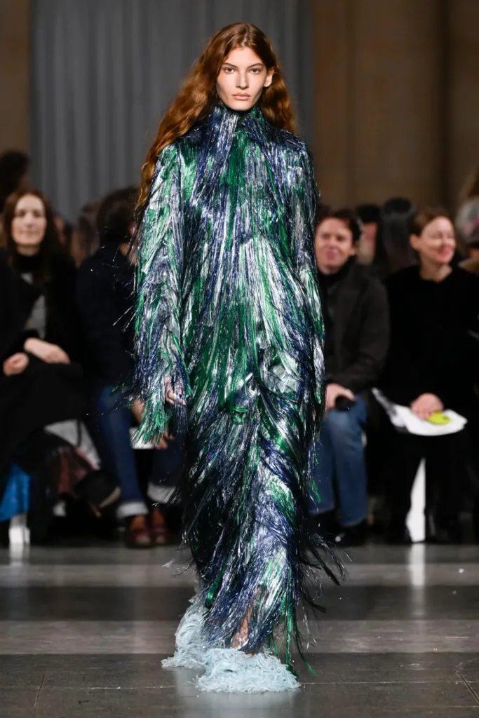 المجموعة كانت “مُتعمَّدة الطبقات: أقمشة مُرقَّعة، وأهداب بريق معدني، وأقواس، وتطريز كريستالي كثيف”.