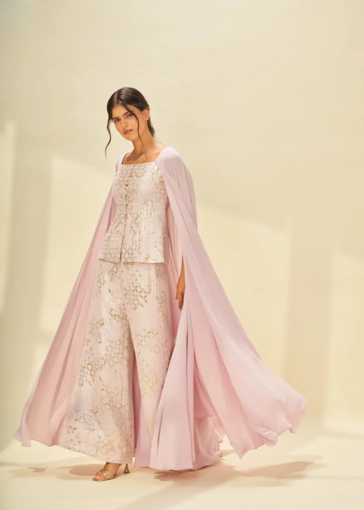 تتألق الزخارف والتطريزات في هذه المجموعة بتفاصيل ذهبية فاخرة، ونقوش متناغمة، وتقنيات تطريز ثلاثية الأبعاد تضيف عمقاً وبريقاً للقطع، مجسدة رؤية أمل الرئيسي الفنية التي تجمع بين الشعرية والفخامة.