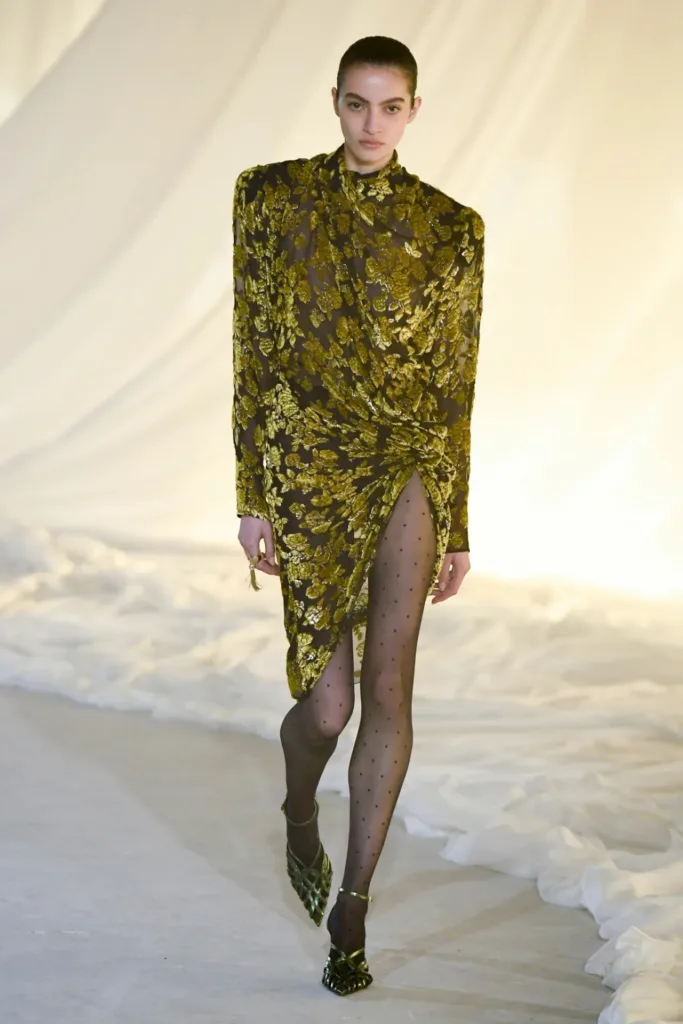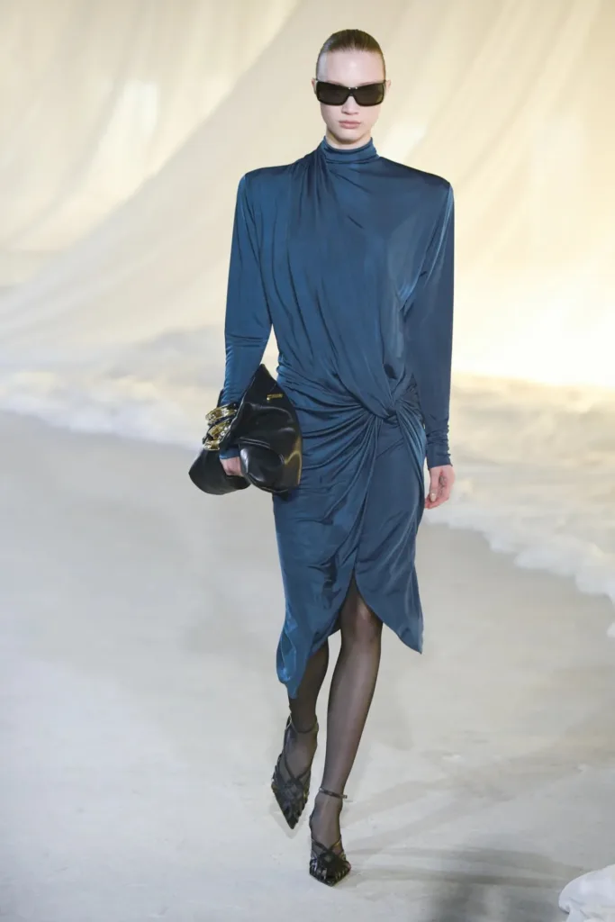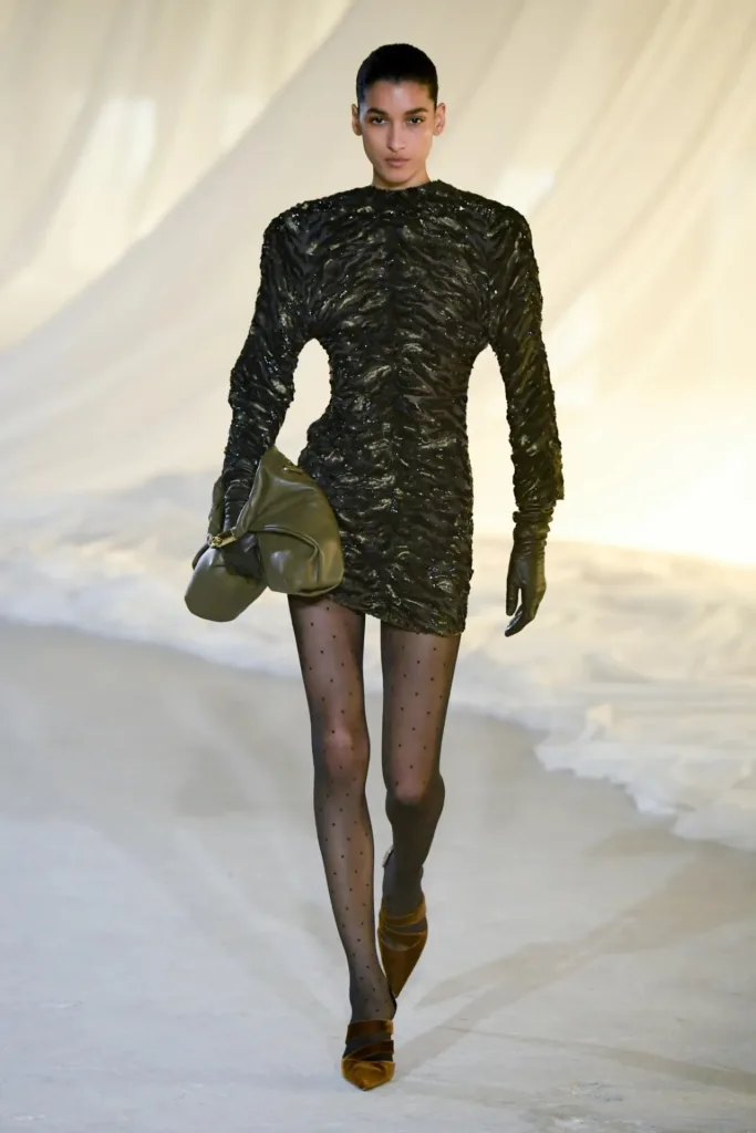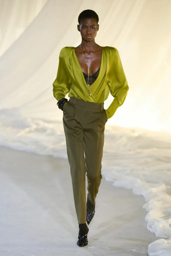 السيلويت في خريف 2026 لم يتخلّ عن هوية بالمان المعمارية، لكنّه أصبح أكثر قرباً من الجسد وأقل “درعاً” فوقه. الأكتاف المصقولة، الخصر المشدود، والورك الذي يُلمَّح إليه عبر القصّات لا عبر الحشوات، كلها عناصر رسمت صورة امرأة قوية، لكن بعلاقة أكثر عضوية مع القطعة مقارنة بالحجم المبالغ فيه في المواسم السابقة.