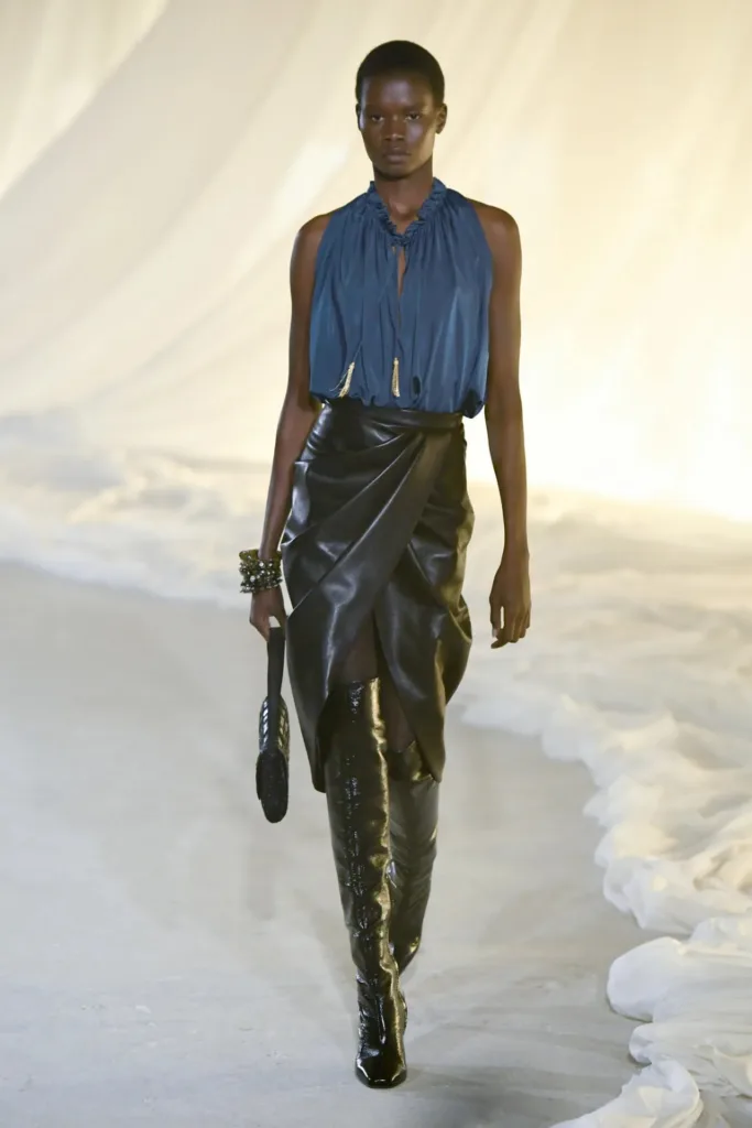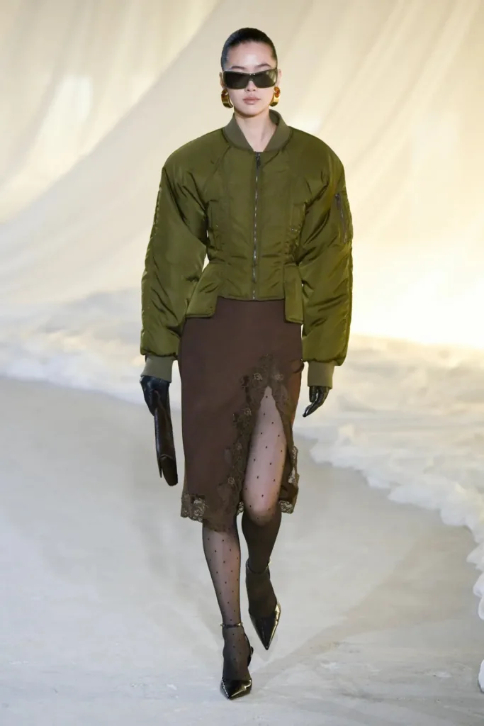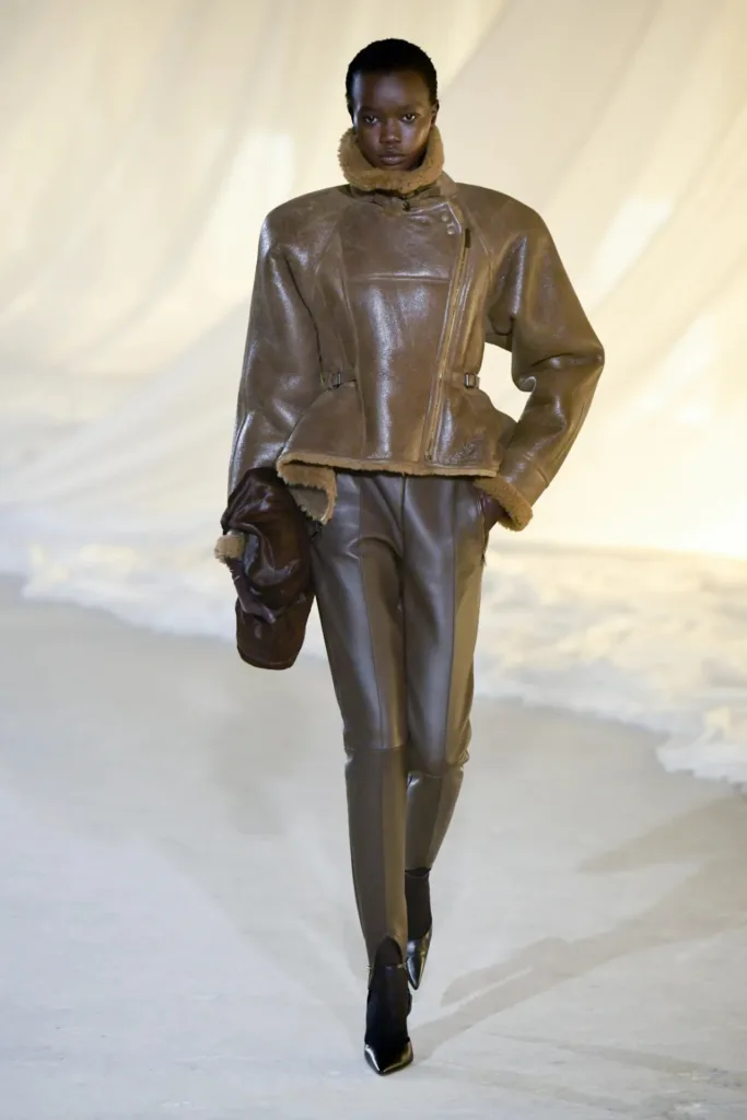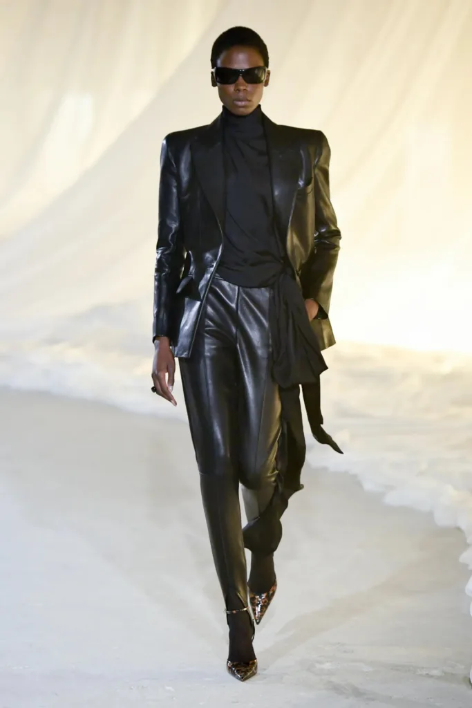 من أبرز الإطلالات الافتتاحية لوك يستحضر أول طيّارة في شركة “إير فرانس”، كواحدة من العميلات التاريخيات لبيار بالمان. الإطلالة جاءت عبر جاكيت جلد أسود بأكتاف مستوحاة من أربعينيات القرن الماضي، خصر مضموم، حافة peplum خفيفة، مع بنطال مدبّب وجوارب من نقط الدانتيل وكعب عالٍ يمنح الحركة إيقاعاً سريعاً “racy” كما وصفه ترون نفسه.