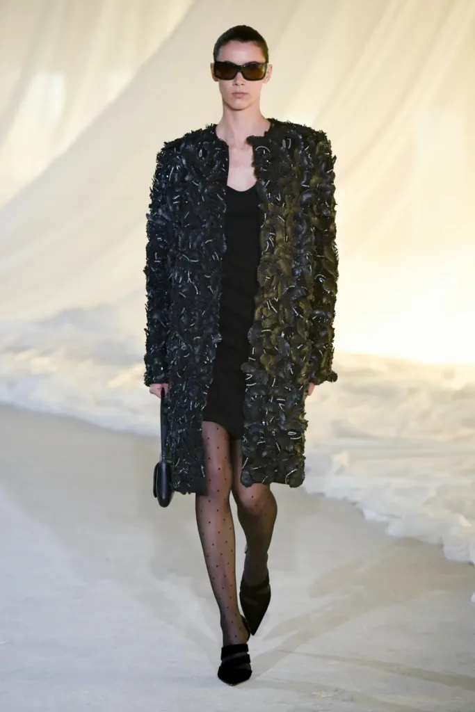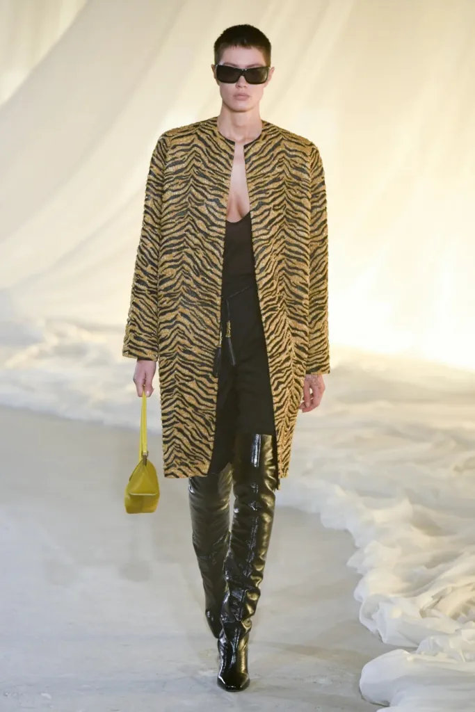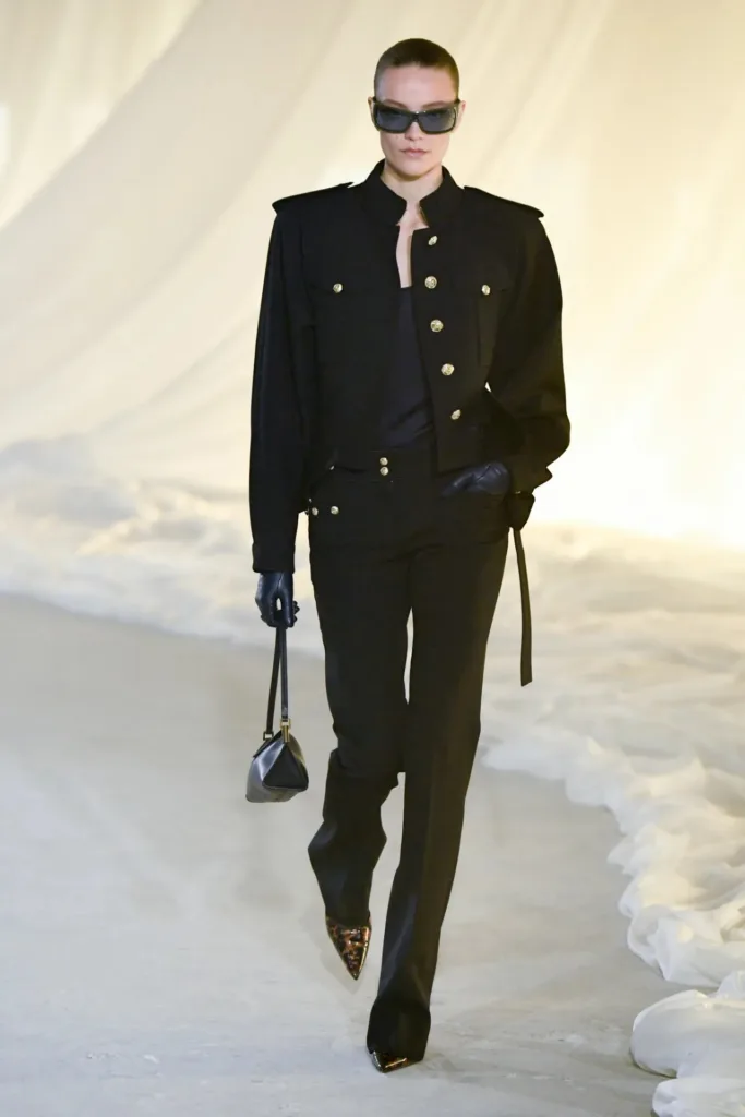 ترون وصف رؤيته بأنها “بذخ بسيط”: الفخامة حاضرة، لكنها تأتي من الخامات، الخياطة، والدقة البنائية أكثر مما تأتي من التطريز الصارخ أو الشعارات الضخمة. الزخرفة انحسرت لصالح درابيه تقني وخياطة دقيقة، مع استمرار حضور بعض الرموز الحيوانية الخاصة بالدار، مثل نقشة الفهد التي ظهرت في جاكيت مطرّز بسحّاب أمامي عملي لا يُضحّي بالترف.