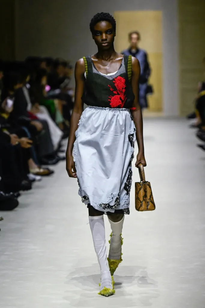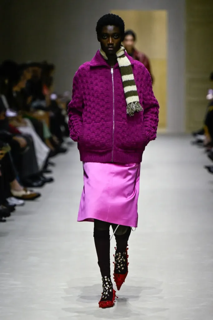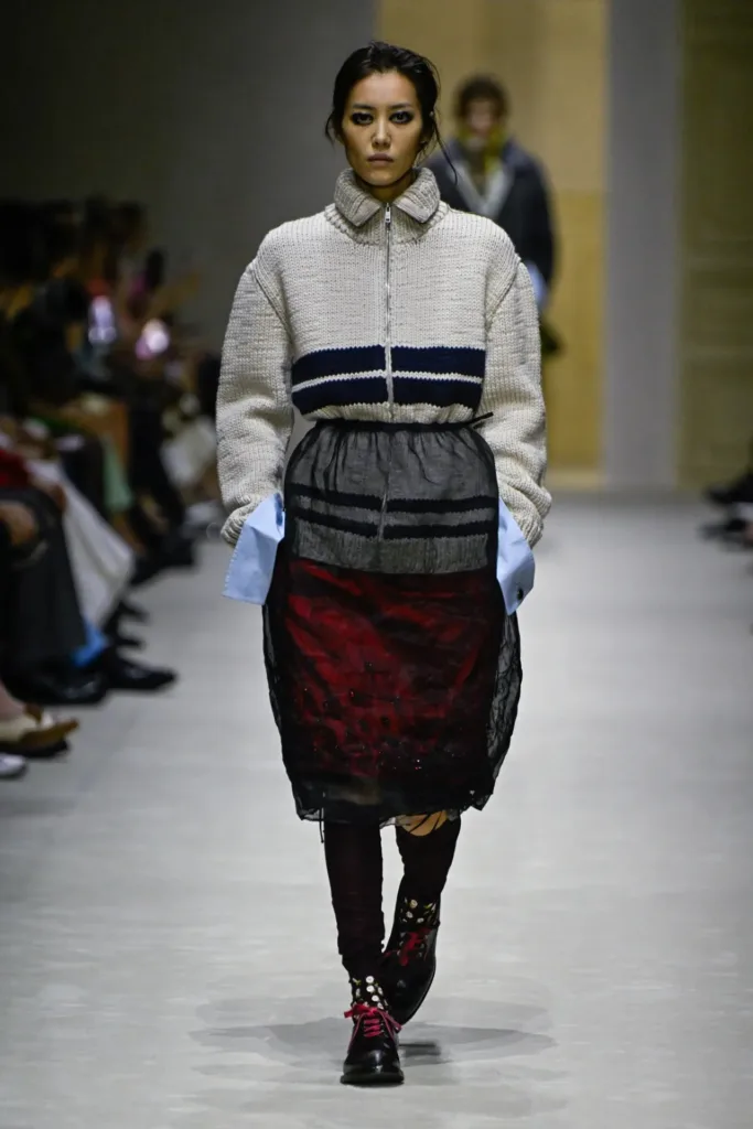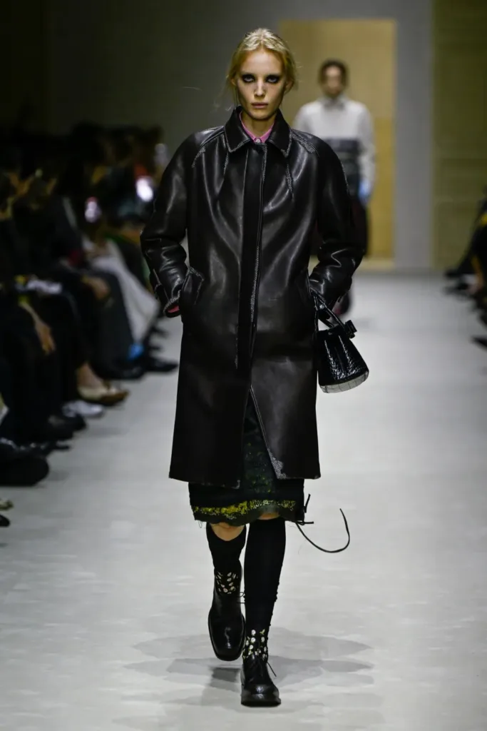 في مواضع أخرى، ظهرت فساتين ساتان مطرزة وخفيفة، مغطاة بجاكيتات صوف قصيرة أو معاطف شتوية كاملة، كأنها إطلالات مسائية تحاول أن تعيش في يوم عمل ممطر. كما تكررت تركيبة سويتر فوق قميص مع تنورة متوسطة الطول، في إعادة قراءة لزي برادا الشخصي الشهير، لكن مع تفاصيل تخريبية صغيرة في الأسفل أو عند القدمين.