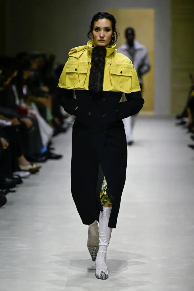 افتتح العرض بسلسلة من المعاطف المحبوكة والمفصلة بخطوط ضيقة قليلًا، مُرفقة بأوشحة صوفية متعددة الألوان وكفات ضخمة وروابط من الفرو أشبه بربطات عنق منحوتة. بعض هذه المعاطف حُمّل بسترات “باركا” قصيرة بلون أصفر فاقع فوقها، تشبه سترات النجاة، لتكسر كلاسيكية القطعة الأساسية بطبقة وظيفية – عبثية في آن.
