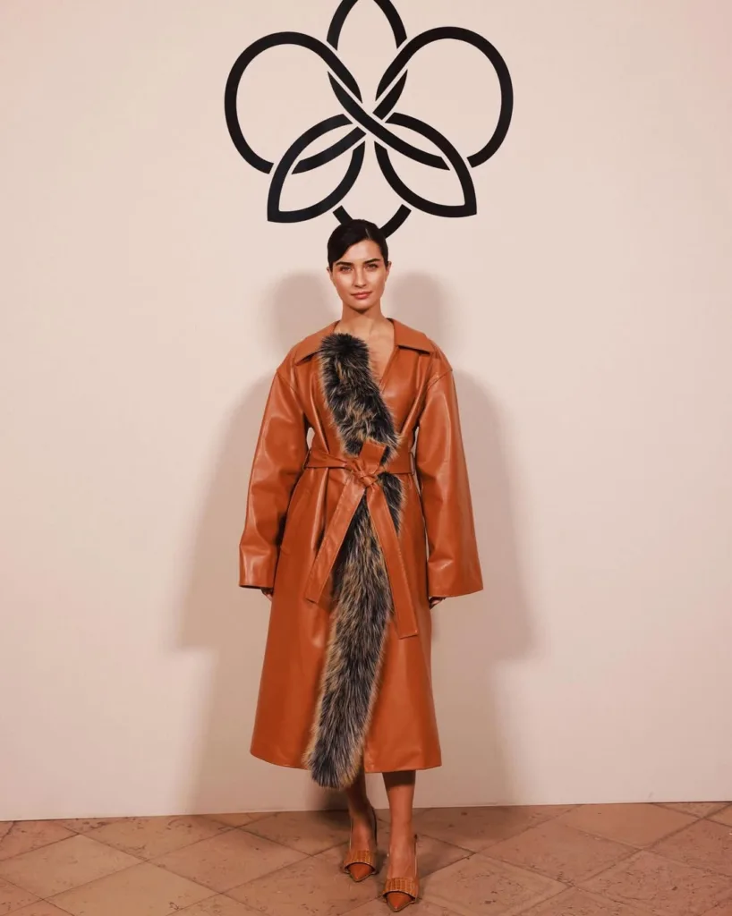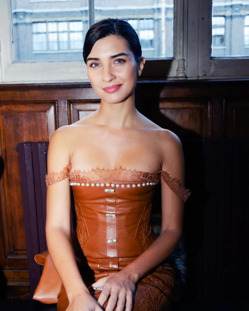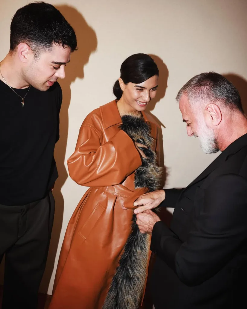 ظهرت النجمة التركية في إطلالة ذهبية أنيقة تتماشى مع فلسفة المصمم اللبناني الشهير جورج حبيقة في خلق عالم من الأناقة الخالدة. التُقطت لها صور احترافية من قبل وكالة “غراند ستوديو” خارج مكان العرض، حيث بدت مشعة بإطلالتها البنية التي جسدت روح المجموعة الجديدة.