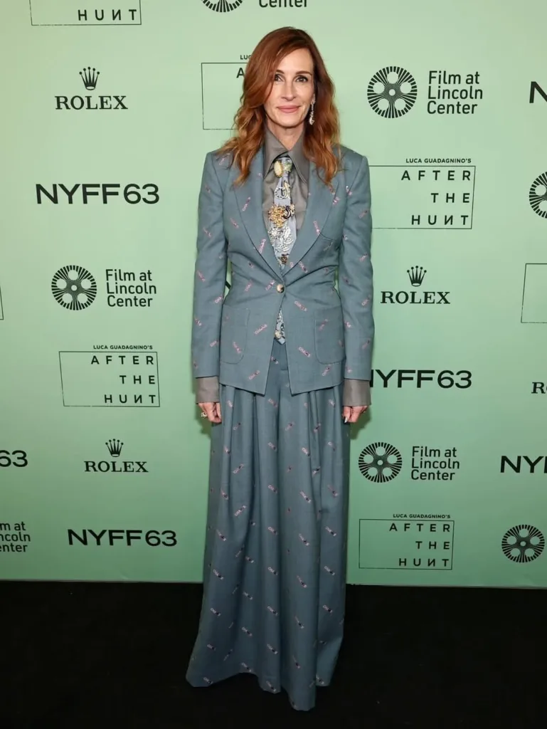 شهد مسرح أليس تولي هول في مركز لينكولن بنيويورك مساء الجمعة 26 سبتمبر الحالي العرض الأول الأمريكي الشمالي لفيلم “After The Hunt” ضمن فعاليات الدورة 63 من مهرجان نيويورك السينمائي. تألقت النجمة الحائزة على جائزة الأوسكار جوليا روبرتس بإطلالة استثنائية من توقيع دار فيفيان ويستوود، حيث ارتدت بدلة بقصة واسعة تجسد بامتياز اتجاه الموضة الحالي “الماذكولين فيمينين” الذي تفضله النجمة في إطلالاتها الأخيرة على السجادة الحمراء.