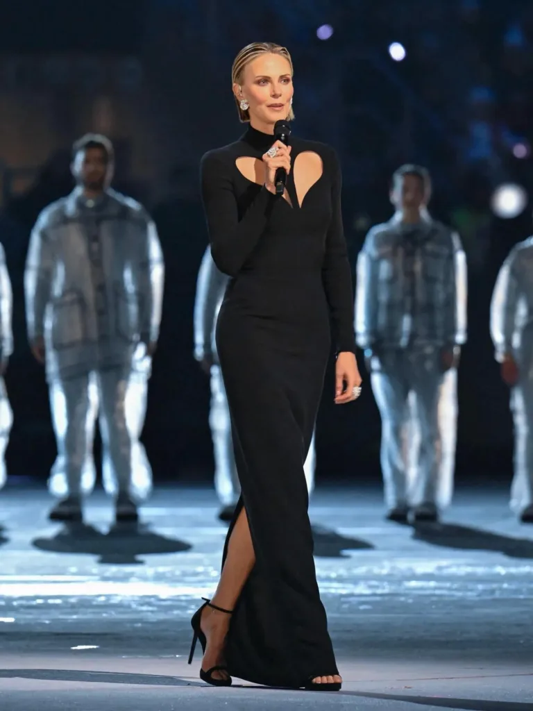 اختارت شارليز ثيرون فستاناً طويلاً أسود اللون بأكمام طويلة من دار فيرساتشي، تميّز بفتحتين أنيقتين عند عظمتي الترقوة تشكّلان معاً ما يشبه القلب، في تفصيل جمالي يحمل رمزية عاطفية عميقة. أكملت النجمة الجنوب إفريقية إطلالتها بأقراط فاخرة وخواتم مزخرفة، إلى جانب حذاء بمنصة مفتوح من الأمام.