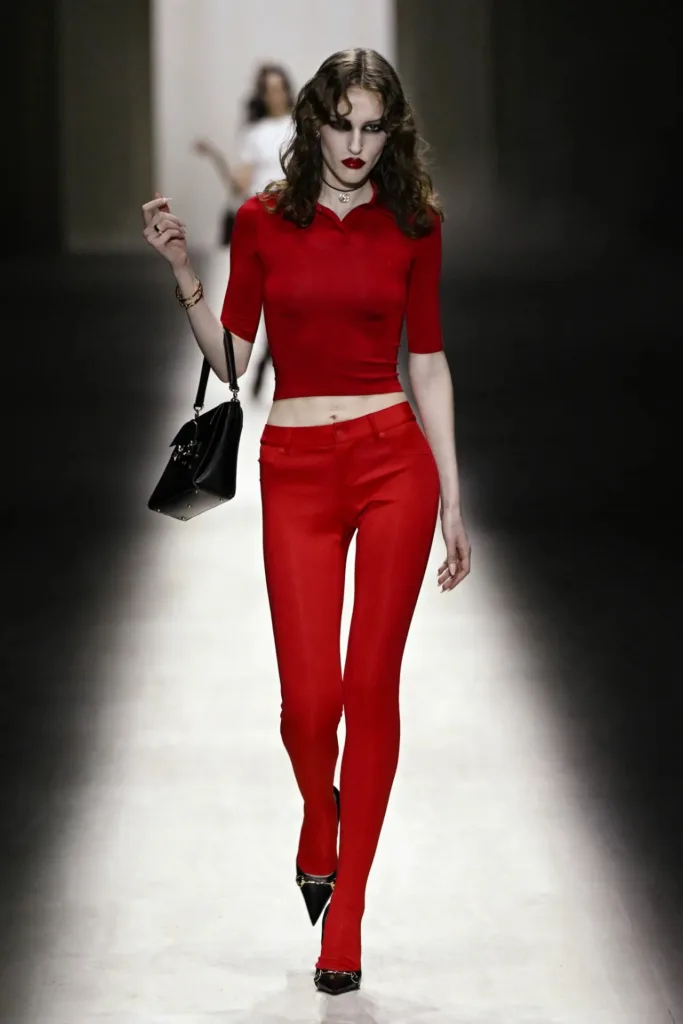 ارتكزت المجموعة على فلسفة واضحة تجعل الجسد محوراً رئيسياً للتصميم. جاءت القطع ضيقة وملتصقة بالجسد بشكل لافت، من فساتين “بودي كون” القصيرة إلى البناطيل منخفضة الخصر مع فتحات جريئة عند الوركين. قدّم ديمنا ما وصفته مجلة “إيل” بـ”بساطة قصوى داخل إطار فخم”، حيث مزج بين البدلات الضيقة الأنيقة والبناطيل المنخفضة ذات القصّات الجريئة، مع لمسات أكثر صخباً تمثّلت في أطقم شفافة من الدانتيل اللامع.