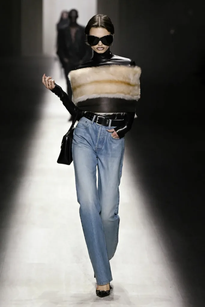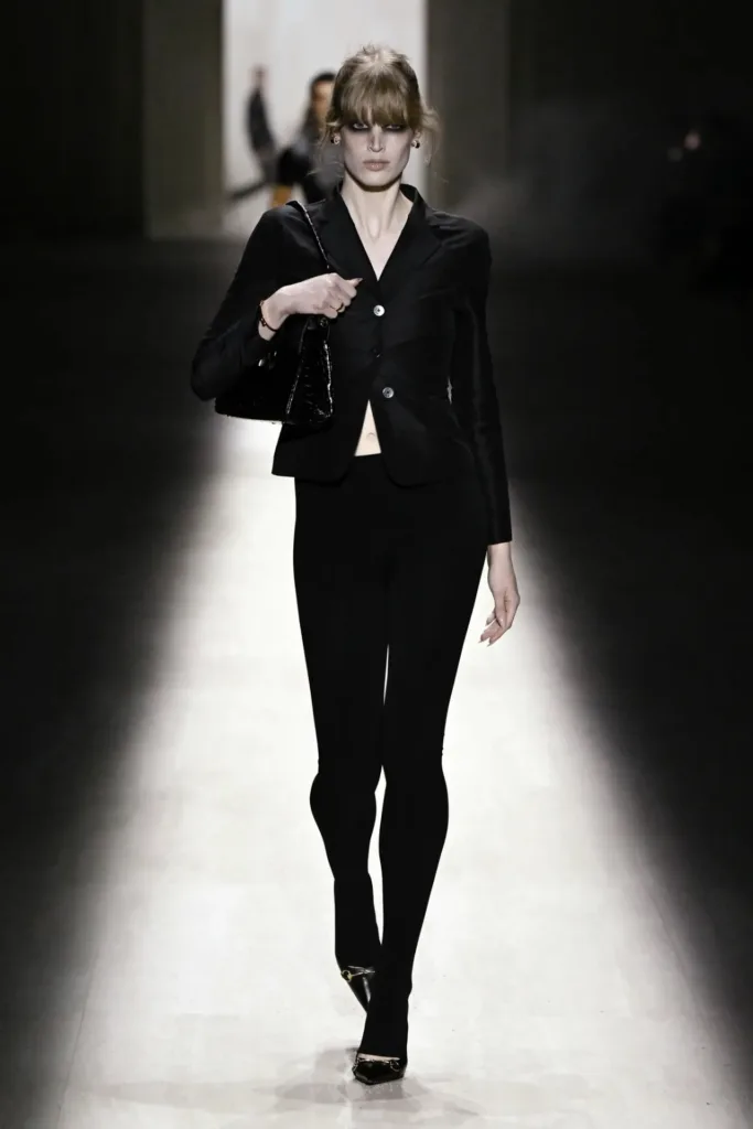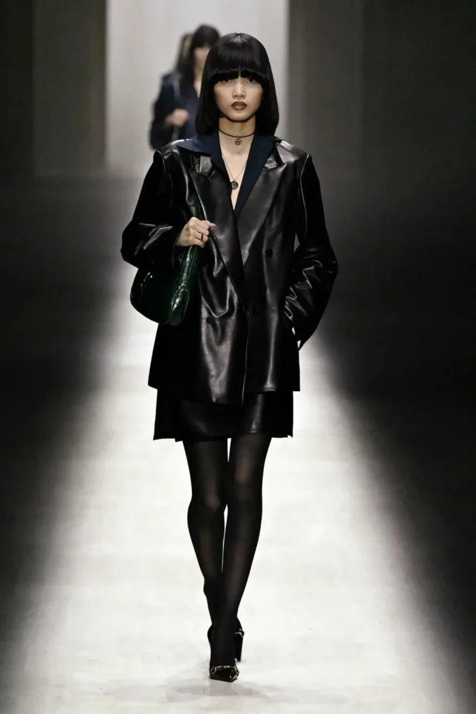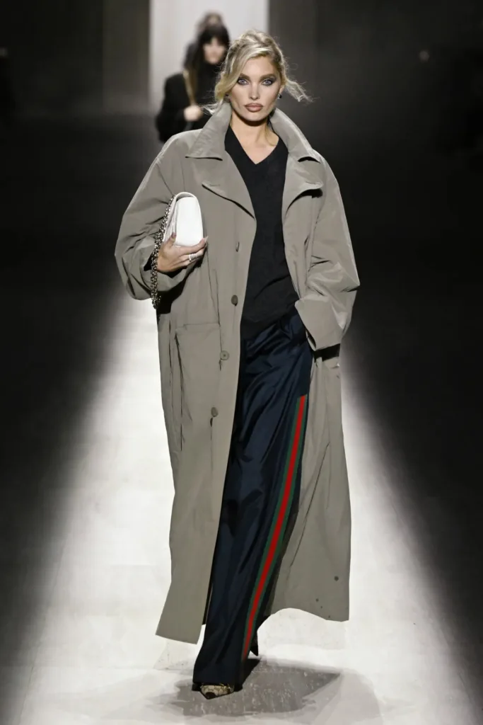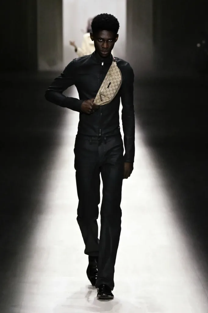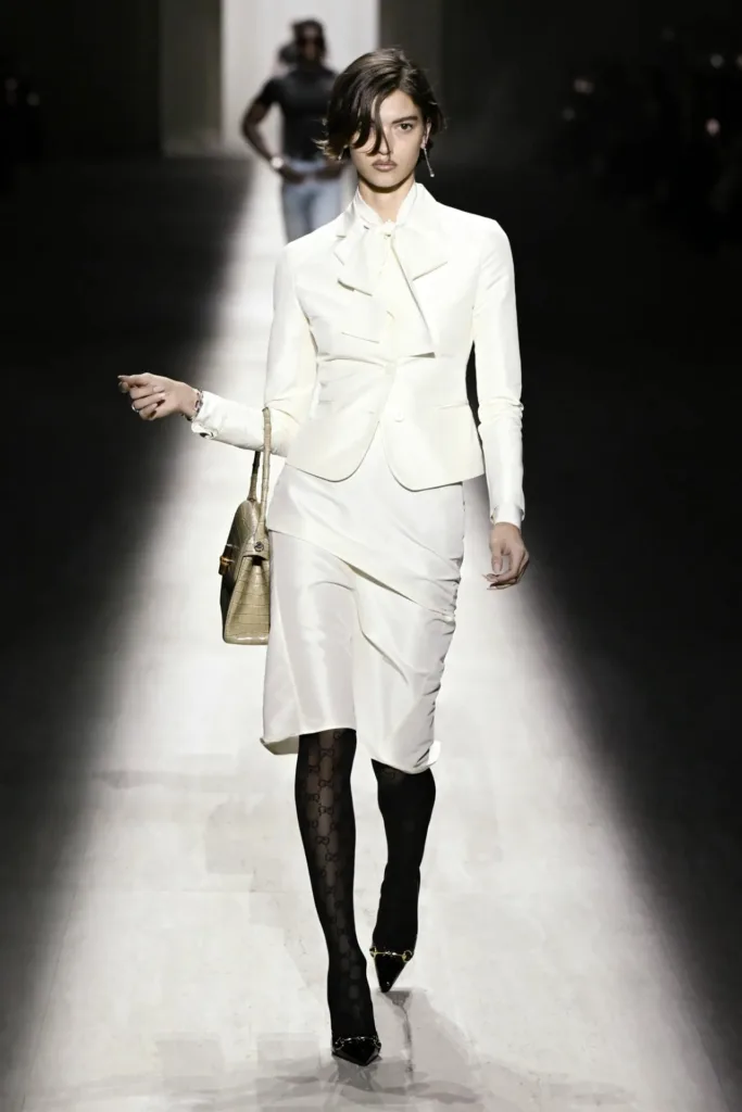 تنوّعت الإكسسوارات بين حقيبة “جاكي” المعاد تصميمها بحجم أكبر وسحّاب جديد، وأحذية ذات كعب عالٍ حاد، وسلاسل ذهبية تتدلّى على الصدر. كما ظهر شعار الحرفين “GG” بكثافة على الأحزمة والجوارب وحقائب الخصر، مع خطوط غوتشي التقليدية بالأخضر والأحمر على بعض القطع.