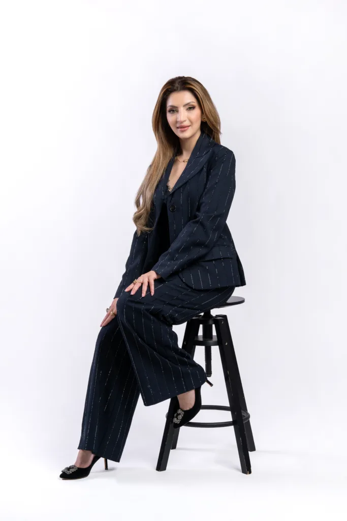 أنا أتعامل مع البدلة كقاعدة أساسية وليس كإطلالة نهائية؛ فالقوالب القوية والخطوط الحادة تخلق حضوراً طاغياً، لكن التفاصيل هي التي تمنحها الروح والشخصية. تستهويني لمسات الزينة، سواء كانت حبات الكريستال، أو أحجار “الديامانتيه”، أو تلك التفاصيل القماشية الناعمة التي تلتقط الضوء وتكسر حدة الهيكل الخارجي. الإكسسوارات هنا تلعب دوراً محورياً؛ فالمجوهرات الرقيقة، والكعب الأنيق، واللمسات المدروسة في التنسيق تمنح الإطلالة توازناً ودفئاً. لا ينبغي لـ “لباس القوة” أن يبدو كدرع حماية، بل يجب أن يكون تعبيراً عن الثقة من خلال هذا التباين الجميل.