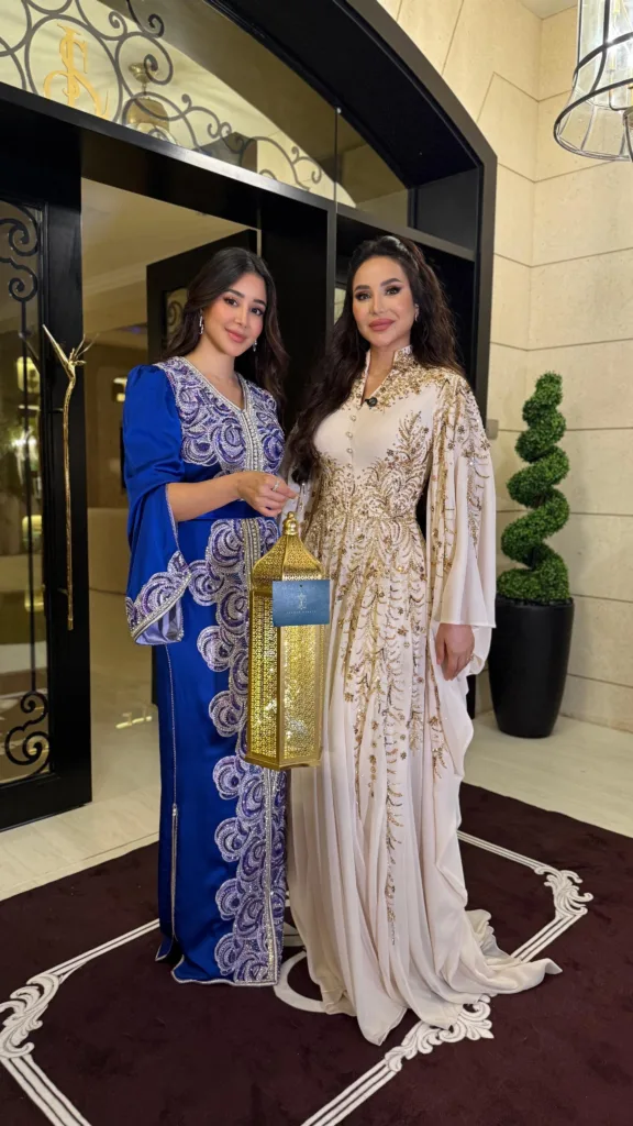 توزعت تطريزات ذهبية دقيقة على القماش بطريقة فنية متقنة، وخصّت منطقتي الصدر والأكمام بتفاصيل أبرز. وأوجدت هذه التطريزات تباينًا هادئًا مع اللون الأبيض الأساسي، ما منح التصميم لمسة لامعة خفيفة دون مبالغة. وأشار موقع ليالينا إلى أن القفطان جاء بلون “أوف وايت” مزينًا بحزام ذهبي عند الخصر ومطعمًا بقماش ذهبي عند الصدر والأكمام.