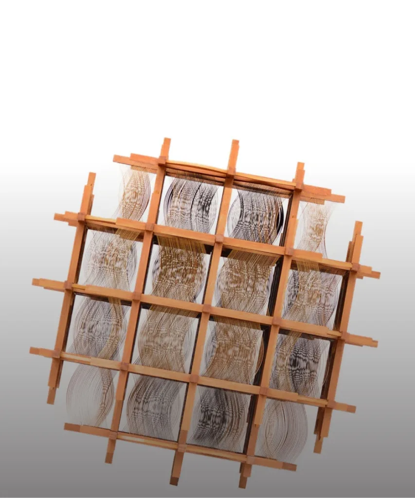 تقدّم الفنانة التايوانية شيا تشين هسيه عملاً بعنوان “إيقاع في شبكة”، يعلّق آلاف الشرائح الرقيقة من الخيزران داخل إطار مكعّب لتوليد نمط كروي متموّج. فيما تعيد الفنانة النيجيرية فاديكيمي أوغونسانيا تفسير تقنية صباغة الأديري إيليكو التقليدية في لحاف يحمل عنوان “لسنا نكذب، لغتكم ليست كافية”.