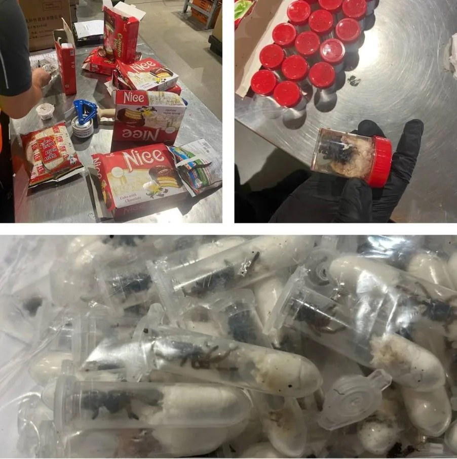 - طريقة التهريب: تم وضع العناكب في علب بلاستيكية صغيرة، وزعت على صناديق كرتونية مصممة لتبدو أنها عبوات كعك بالشوكولاتة («سفنجة» أو بسكويت).