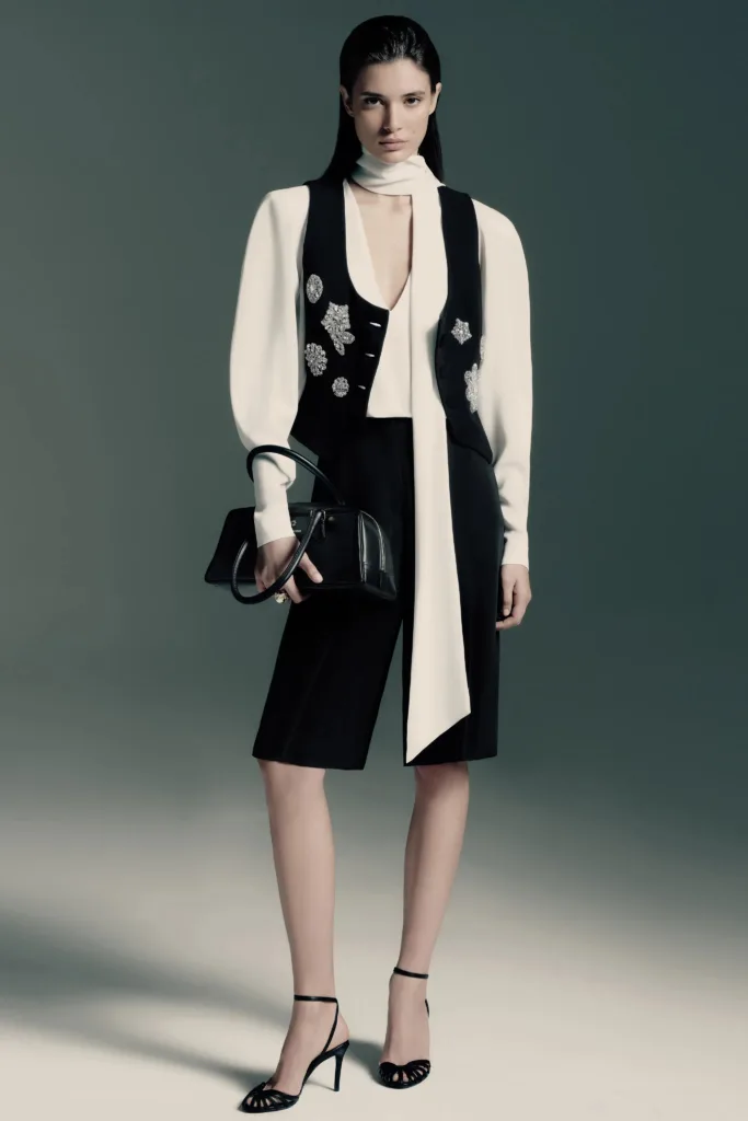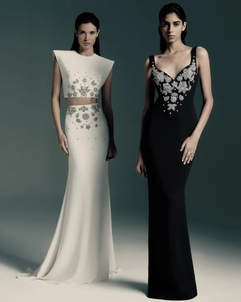أما الأزياء المسائية فقد زُينت بالترتر الأسود أو الفضي الذي يخلق أنماطاً عضوية على الفساتين الشفافة، بالإضافة إلى السترات السوداء والعباءات. وقد ظهرت التطريزات ثلاثية الأبعاد على التول الحريري مع أنماط زهرية منمنمة، متوازنة مع الخياطة الحادة في خامة الكادي.