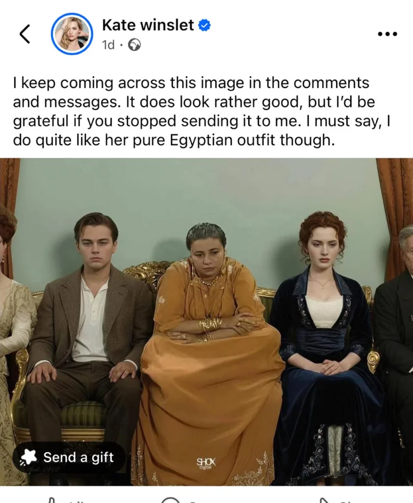 - الصورة المنتشرة عبر حساب كيت وينسلت الرسمي على فيسبوك جذبت اهتمامًا كبيرًا حيث أبدت النجمة إعجابها بالزي المصري الأصيل في الصورة، لكنها طلبت من المتابعين التوقف عن إرسالها بسبب تكرار ظهورها في التعليقات والرسائل.