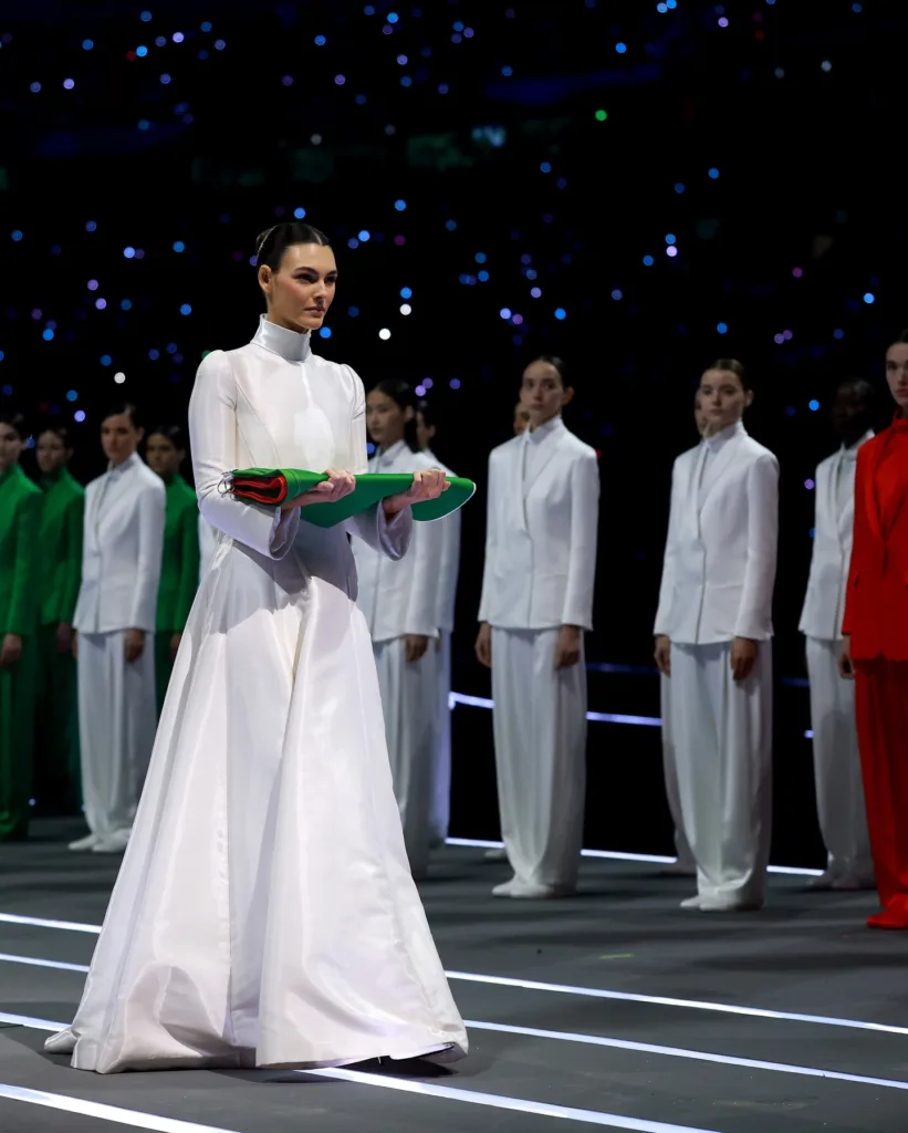 شكّلت فقرة تقديم العلم إلى حرس الشرف واحدة من أبرز المشاهد البصرية في الحفل. سارت ثلاث مجموعات من العارضات على ثلاث منصات عرض داخل الملعب، مرتدياتٍ بدلات فضفاضة بتوقيع أرماني المعروف بقصّاته المريحة والأنيقة.