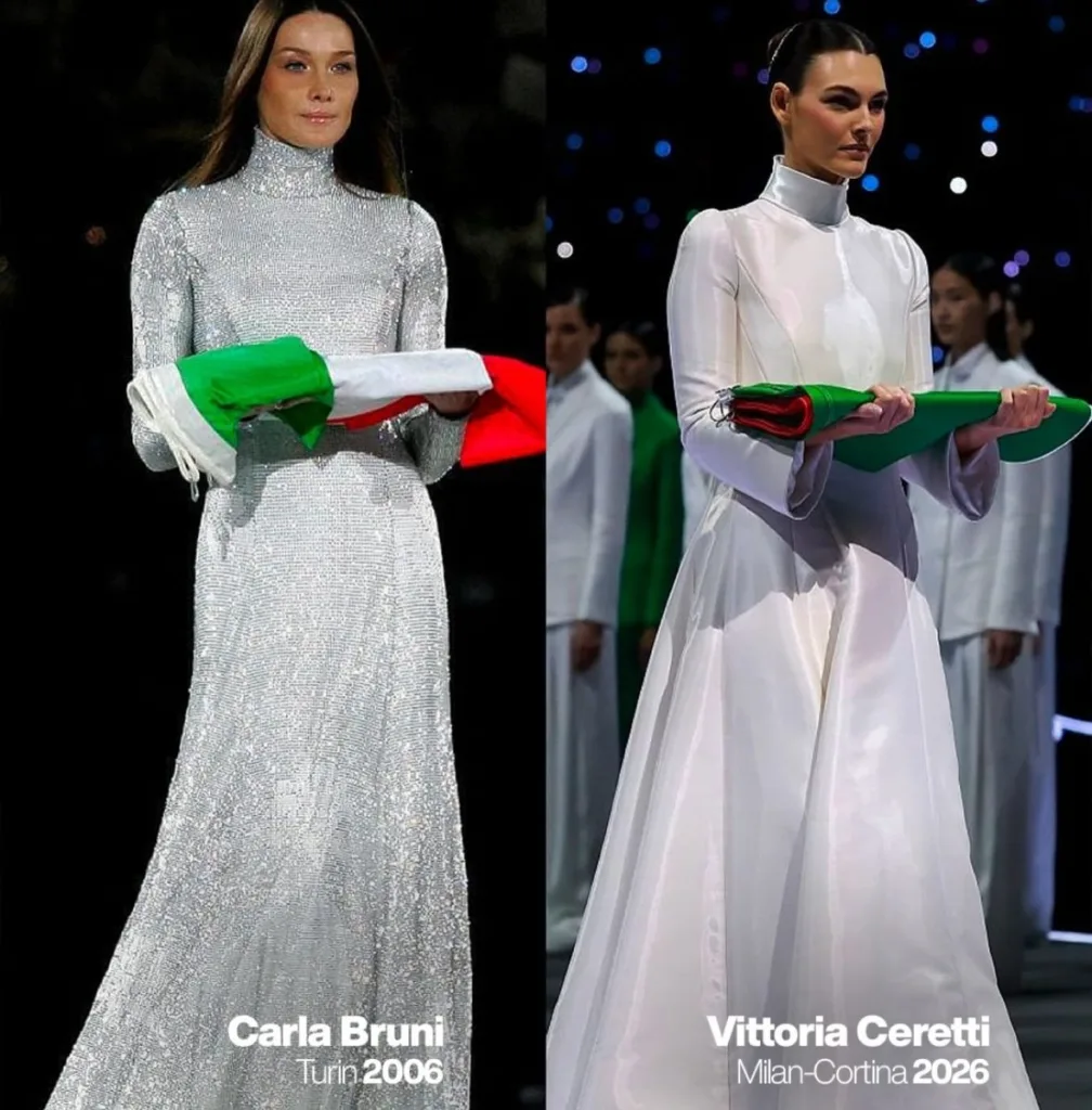 أعاد هذا المشهد إلى الأذهان لحظة مشابهة قبل عقدين، حين حملت العارضة والمغنية كارلا بروني العلم الإيطالي في حفل افتتاح أولمبياد تورينو الشتوي عام 2006. ارتدت بروني حينها فستاناً متلألئاً من أرماني مستوحى من الكريستال والجليد.