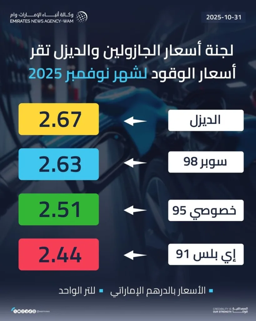 حددت لجنة متابعة الأسعار أسعار الوقود لشهر نوفمبر 2025 في الإمارات، حيث بلغ سعر لتر الديزل 2.67 درهم، وسعر لتر بنزين سوبر 98 هو 2.63 درهم.