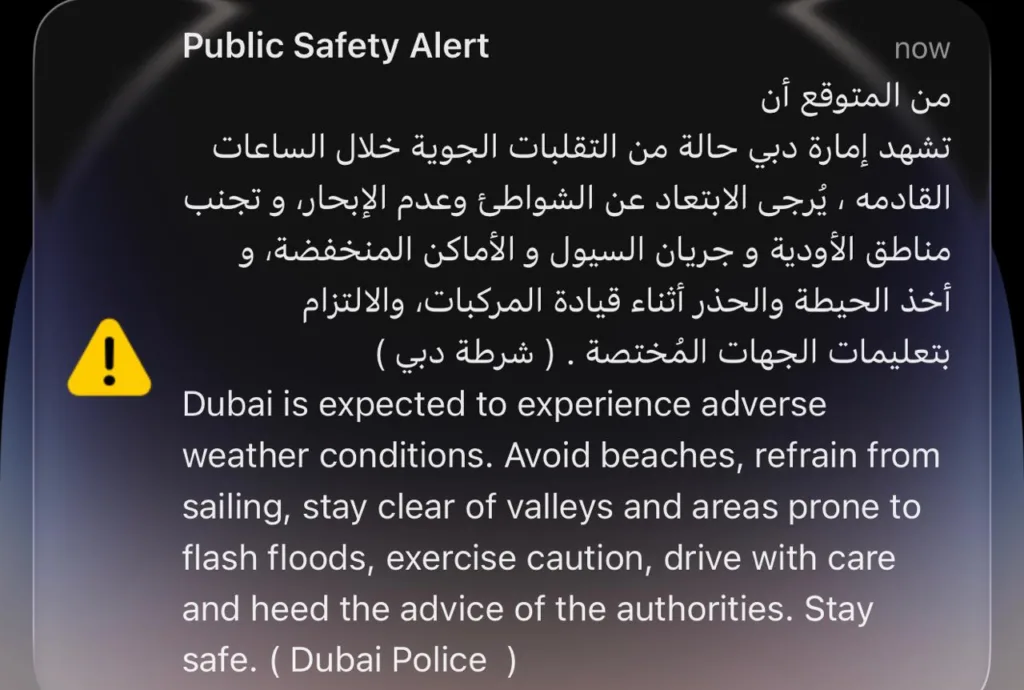 حذرت شرطة دبي من تقلبات جوية متوقعة خلال الساعات القادمة في الإمارة. وأوصت بتجنب الإبحار على الشواطئ، والابتعاد عن الأودية ومجاري السيول والمناطق المنخفضة.