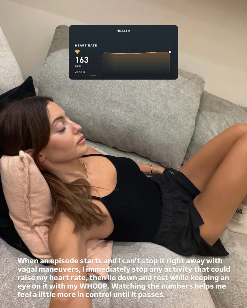 أضافت أنها عندما تفشل في السيطرة على النوبة، تتوقف عن أي نشاط بدني وتلجأ إلى الاستلقاء مع مراقبة نبضها بجهاز خاص يمنحها شعوراً بالاطمئنان حتى زوال الحالة.