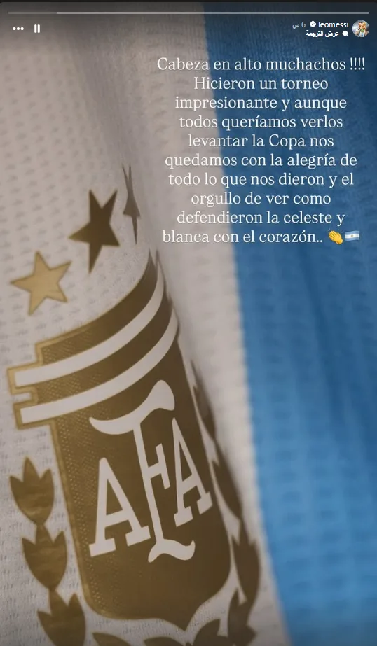 بعد نهاية المباراة، نُشرت رسالة دعم مؤثرة من النجم الأرجنتيني ليونيل ميسي عبر حسابه الرسمي على “إنستغرام”، حيث خاطب لاعبي منتخب بلاده قائلاً: