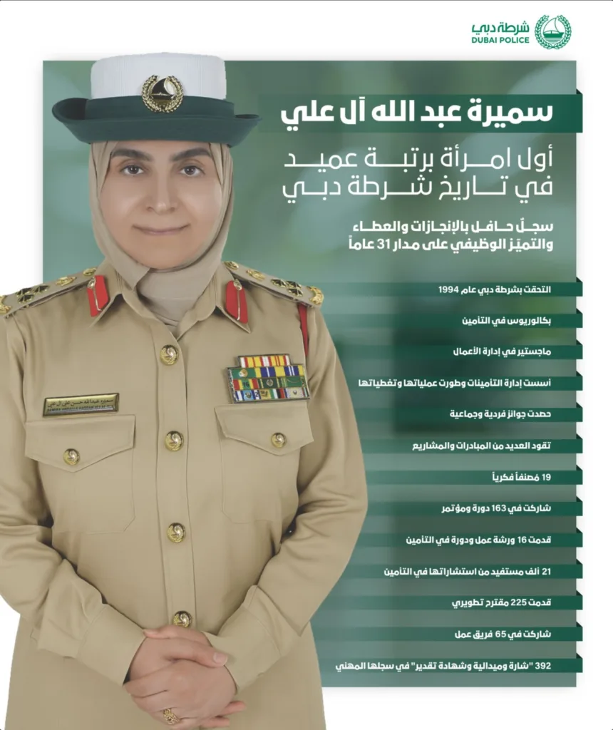 العميد سميرة آل علي تصبح أول امرأة تصل إلى رتبة عميد في شرطة دبي، مع خبرة تزيد على 31 عاماً وإنجازات بارزة في مجال الأمن والتمكين.