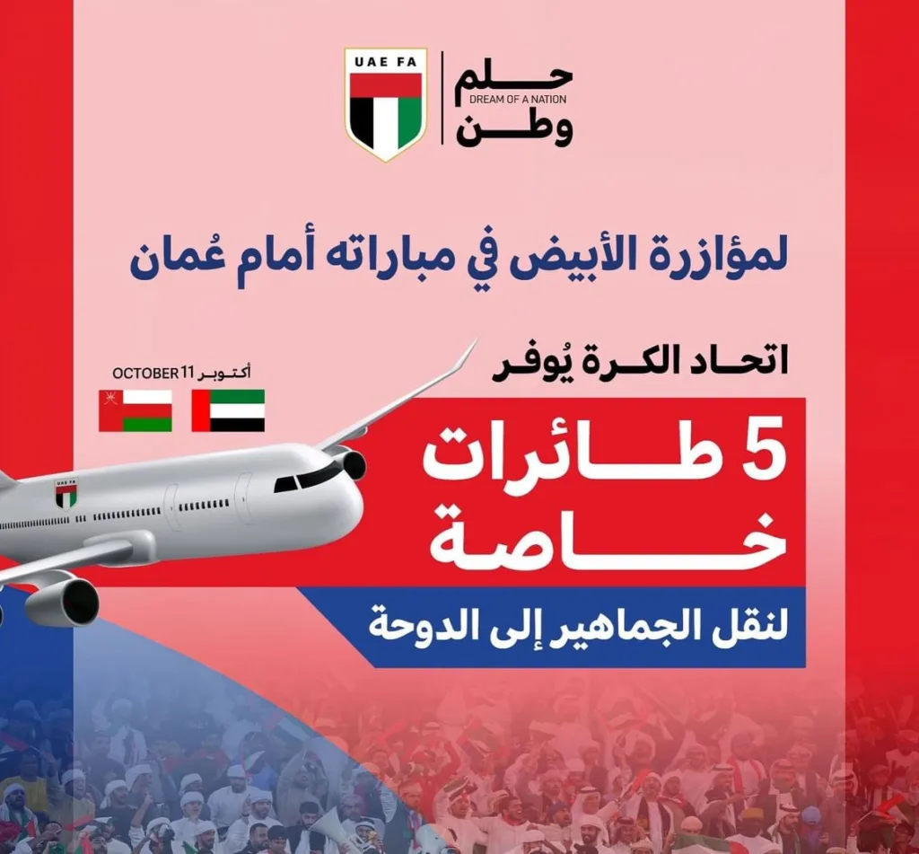 أعلن اتحاد الإمارات لكرة القدم عن نقل جماهير المنتخب الوطني إلى العاصمة القطرية الدوحة عبر 5 طائرات خاصة لدعم المنتخب في مباراته أمام عمان يوم 11 أكتوبر على استاد حمد بن جاسم بنادي السد ضمن الملحق الآسيوي المؤهل إلى كأس العالم 2026.