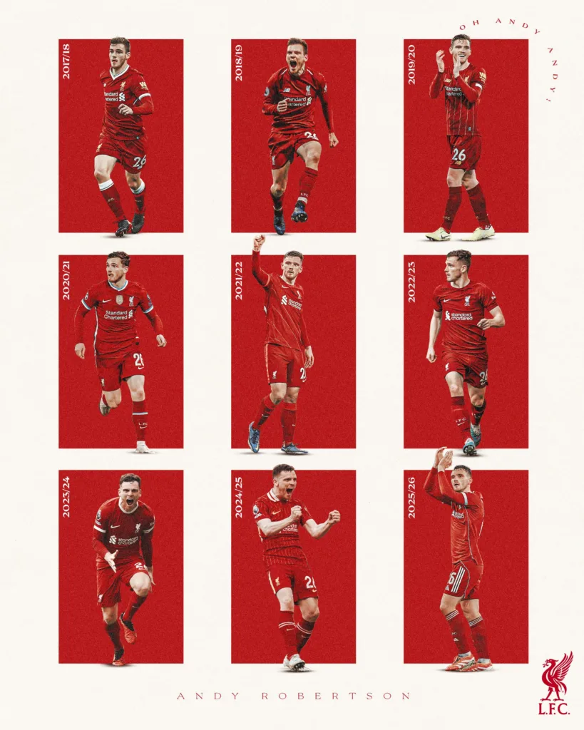 أعلن نادي ليفربول رحيل ظهيره الأيسر أندرو روبرتسون نهاية الموسم بعد 9 سنوات حافلة بالألقاب، حيث شارك في 373 مباراة وسجل 13 هدفًا وصنع 69. يُعرف روبرتسون بكونه أكثر مدافع صنعًا للأهداف في تاريخ الدوري الإنجليزي، وحصد 8 ألقاب مع الفريق، بما في ذلك دوري أبطال أوروبا والدوري الممتاز. كما تم تعيينه نائبًا للقائد وتم تكريمه بوسام عضو الإمبراطورية البريطانية لخدماته في كرة القدم والعمل الخيري.